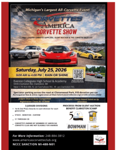 Every year “America’s Corvette Club” hosts the “Corvette’s America Car Show.” The show is held at “Everest Academy” at 5935 Clarkston Road, Clarkston Michigan. The Corvette Show is held on the last Saturday in July